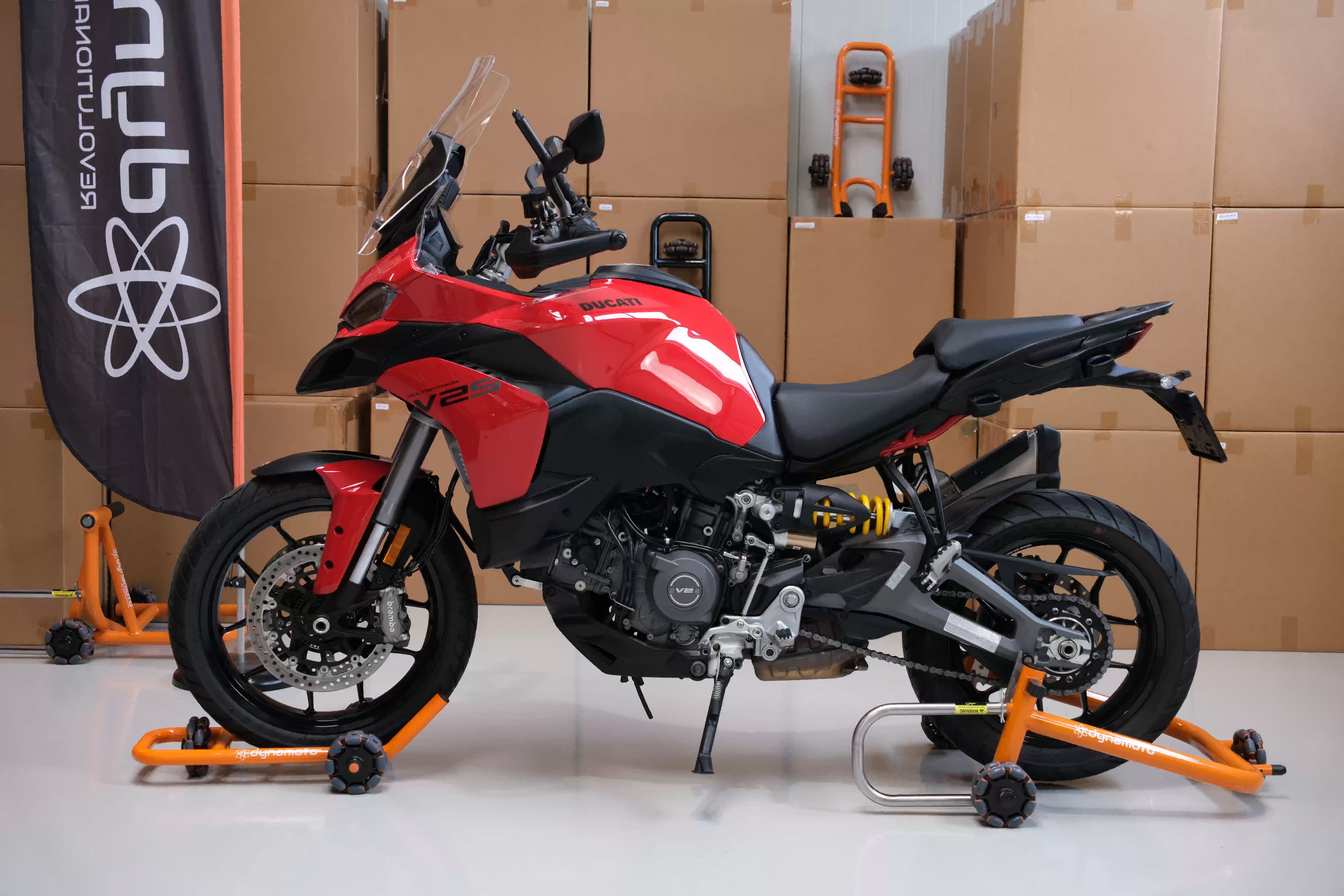Der revolutionäre Motorradständer von Dynamoto ermöglicht die multidirektionale Bewegung Ihres Motorrads auf Oberflächen wie Beton, Asphalt und Fliesen. Das Design hält Ihre Ducati Multistrada in einer stabilen aufrechten Position für eine sichere, kompakte und einfache Lagerung. Dieser multidirektionale Motorrad-Montageständer passt zu den folgenden Modellen: