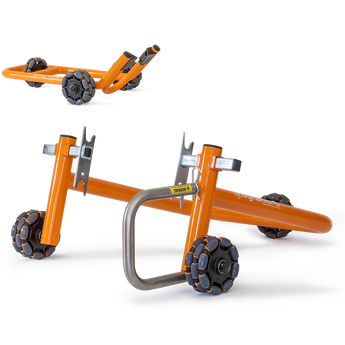 Enkelzijdige achterstandaard: Past op fietsen met een enkelzijdige achterbrug en een grote centrale holte in de achterwielnaaf. Verwisselbare spindels die gemakkelijk kunnen worden aangepast voor verschillende fietsmerken: BMW, Ducati, MV Agusta, Honda, KTM, Triumph.